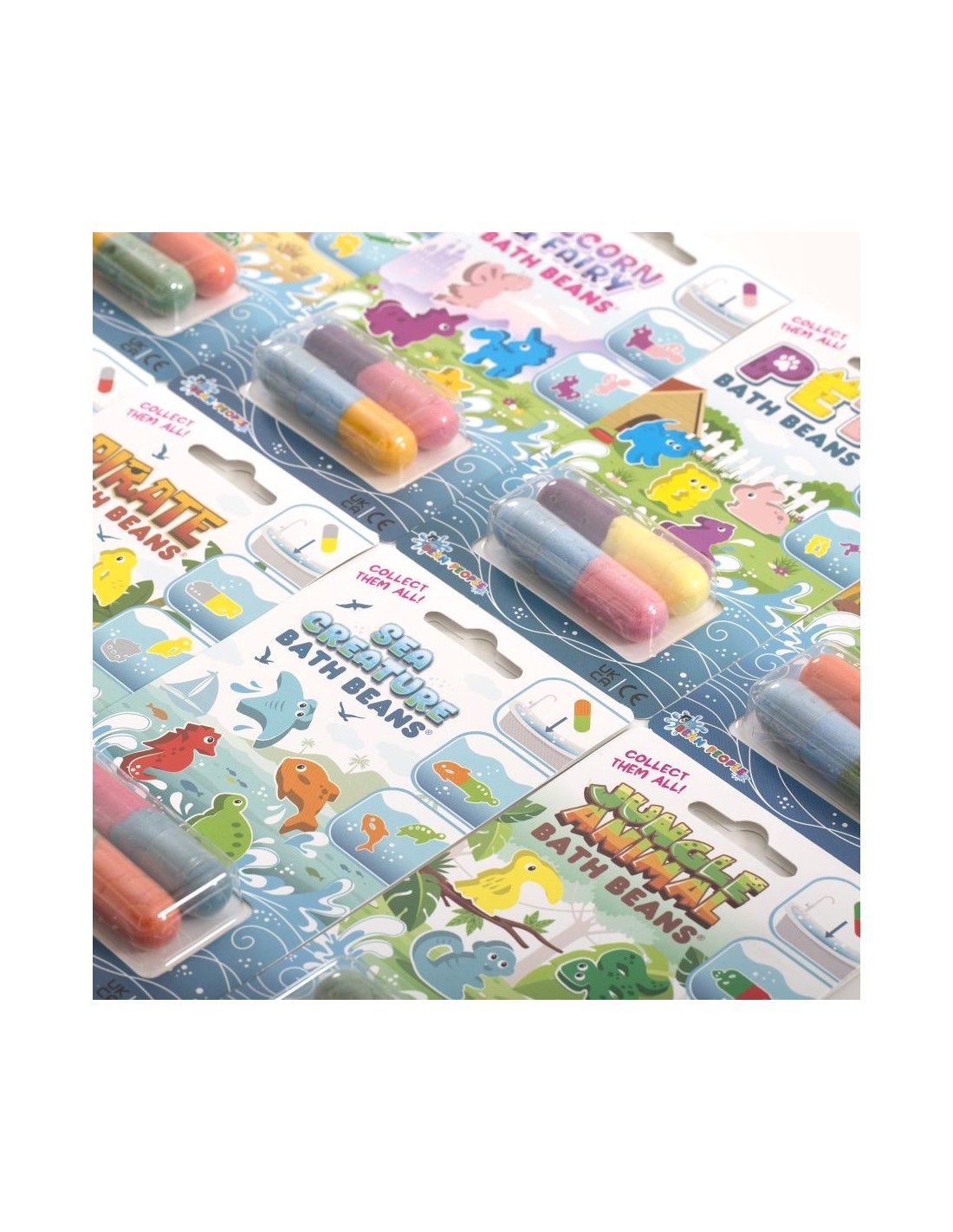 In elke bean zitten twee leuke badspeeltjes verstopt voor kinderen! De capsules zijn van gelatine gemaakt (hetzelfde als vitaminecapsules). BATH BEANS worden sinds 1988 handgemaakt in Zuid-Afrika door een sociaal betrokken bedrijf. De aankoop van Bath Beans zorgt voor werkgelegenheid van ongeveer 100 werknemers en draagt bij aan lokale educatieve projecten voor kinderen.