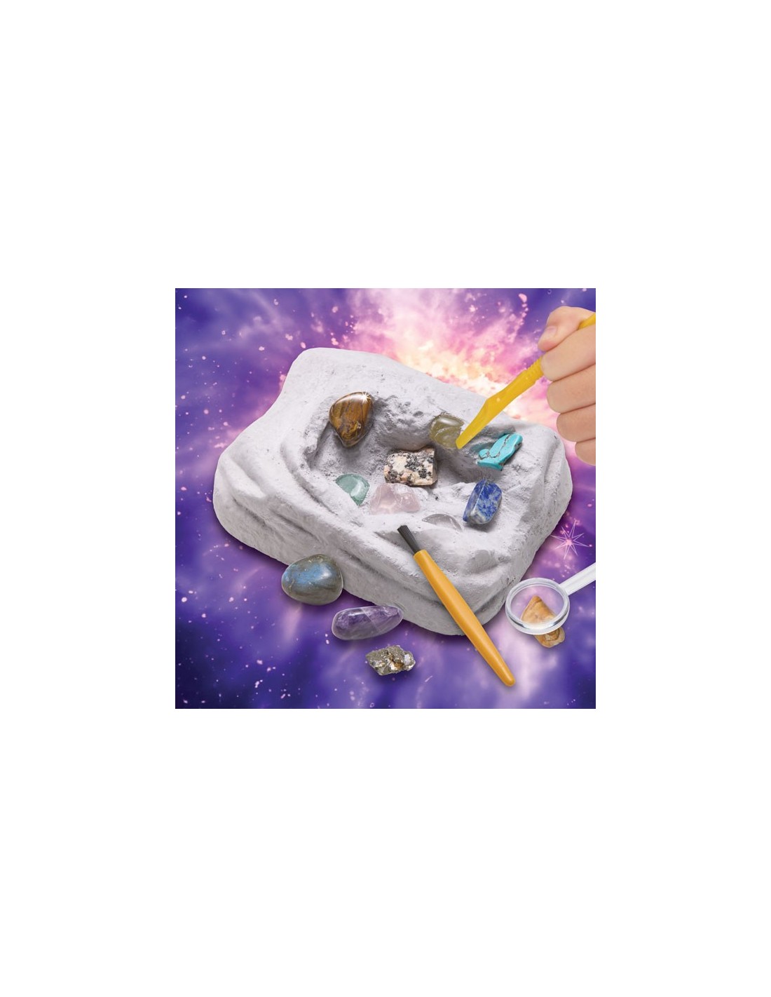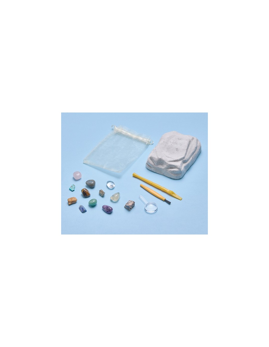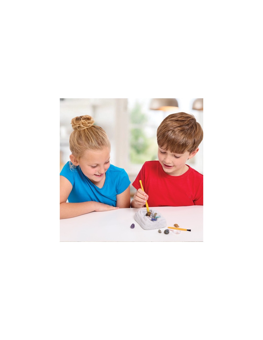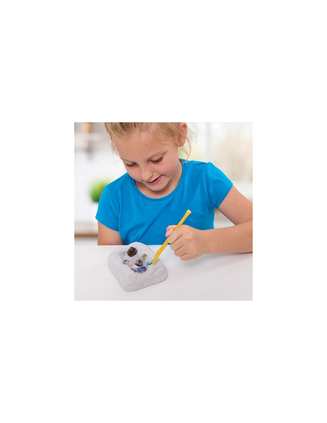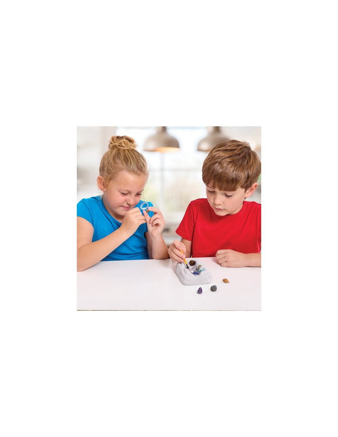 Vind en ontdek 12 schitterende rotsen, mineralen en edelstenen in je eigen opgravingsblok! Gebruik de beitel om te graven en de borstel om je speciale stukken schoon te maken. Gebruik het vergrootglas om ze van dichterbij te bekijken. Bewaar je schatten in het handige opbergzakje. Handige online tutorial.