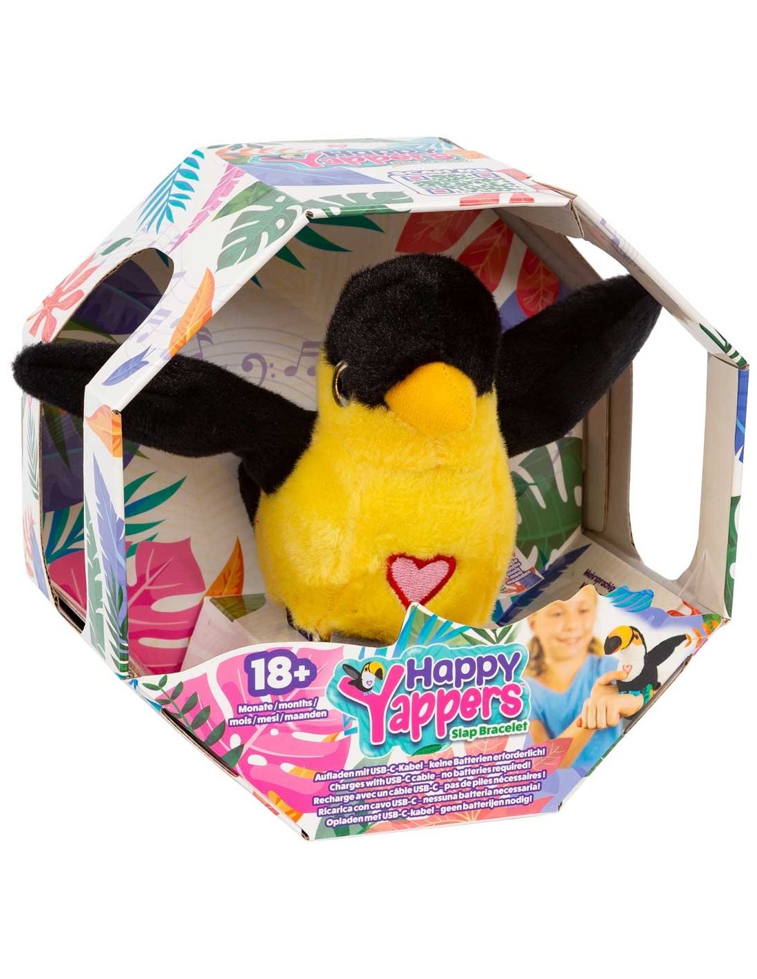 Beleef interactief spel zoals nooit tevoren met Happy Yappers! Deze schattige pluchen vogeltjes herhalen gesproken woorden en geluiden, zingen het vrolijke Happy Yappers liedje (Rock 'n' Robin) en fladderen met hun vleugels. Gemaakt van hoogwaardig zacht polyester en te dragen als klaparmband. De Happy Yappers zijn de ideale metgezel voor kinderen. USB-C oplaadbaar en goedgekeurd vanaf 18 maanden en natuurlijk veel ouder!