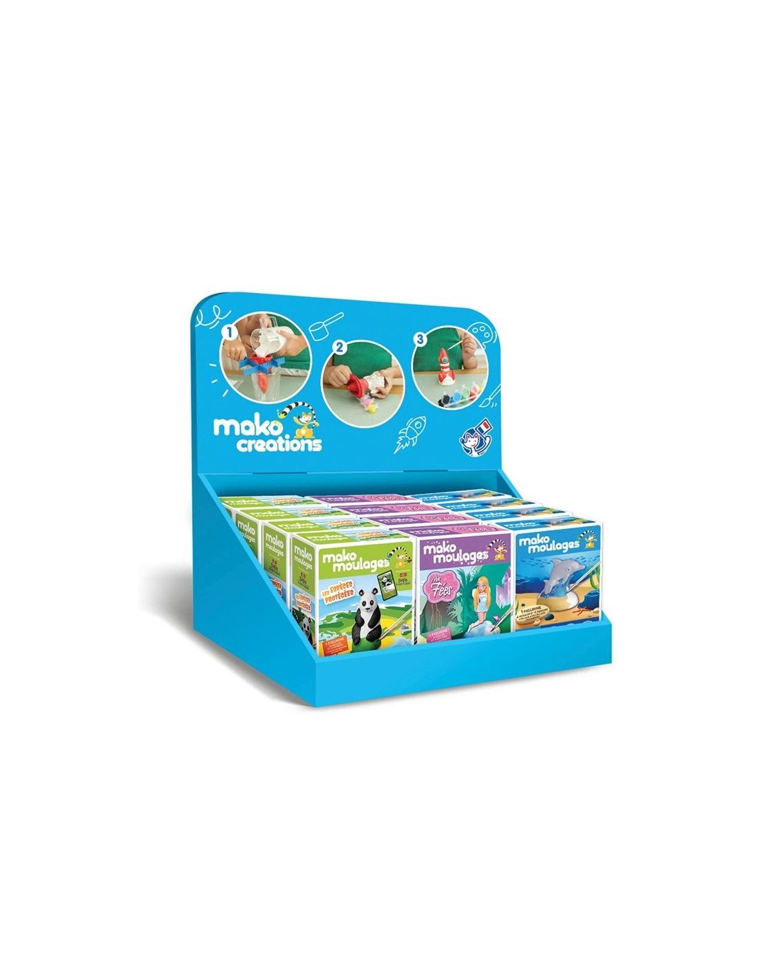 Mako Moulages - Display in bruikleen gevuld met 12 pakketjes 1 mal panda fee dolfijn