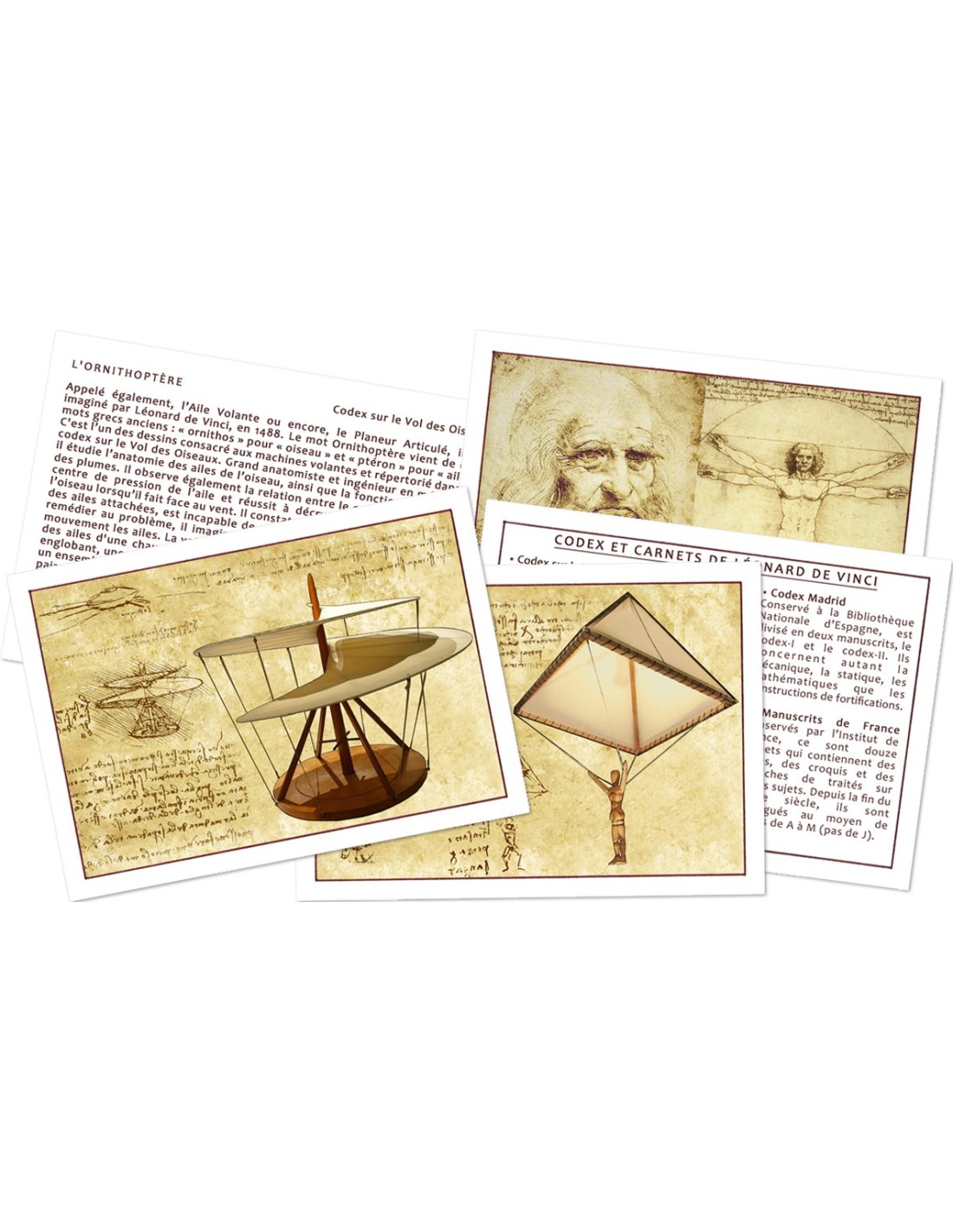 Vertrek op ontdekkingsreis naar de bijzondere wereld van Leonardo da Vinci en zijn legendarische uitvindingen. Deze mooie kaarten zullen je alle geheimen onthullen van dit creatieve genie en van de ingewikkelde machines die belangrijk zijn geweest in de loop van de geschiedenis.