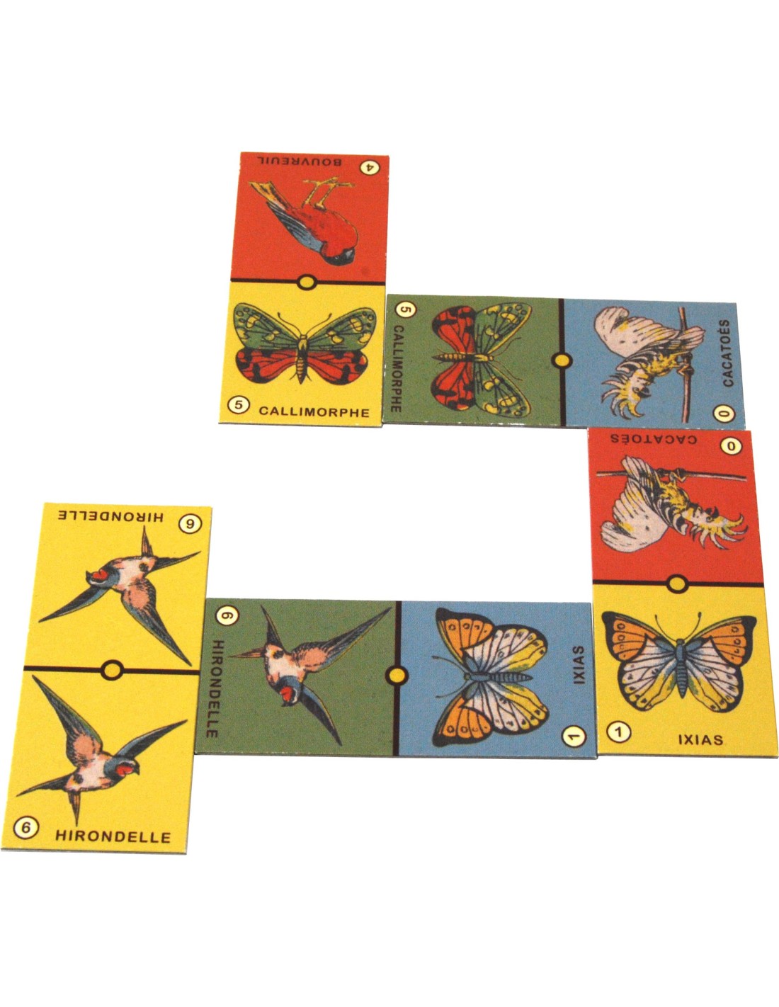 Klassiek dominospel in retro stijl met 28 mooie afbeeldingen van vogels en vlinders. De eerste die al zijn kaarten heeft gespeeld heeft het spel gewonnen.