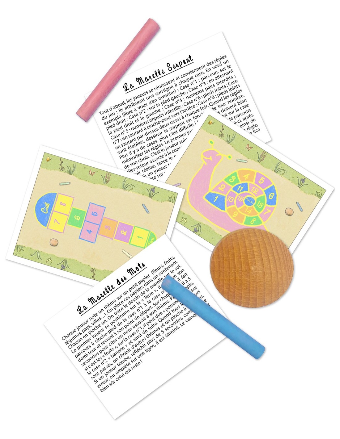 De klassieke hinkelspelletjes met spelregels (Franstalig) krijtjes en palet / steen.