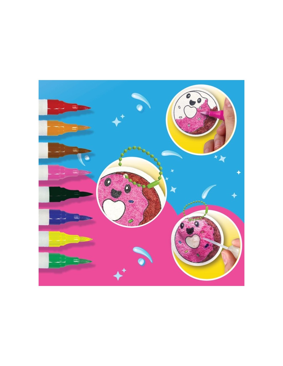 Inclusief 4 dubbelzijdige markers (8 kleuren), 6 voorgesneden en voorgetekende canvassen, 6 sleutelhangers, 6 geperforeerde blanco canvassen en 2 waterapplicators.
