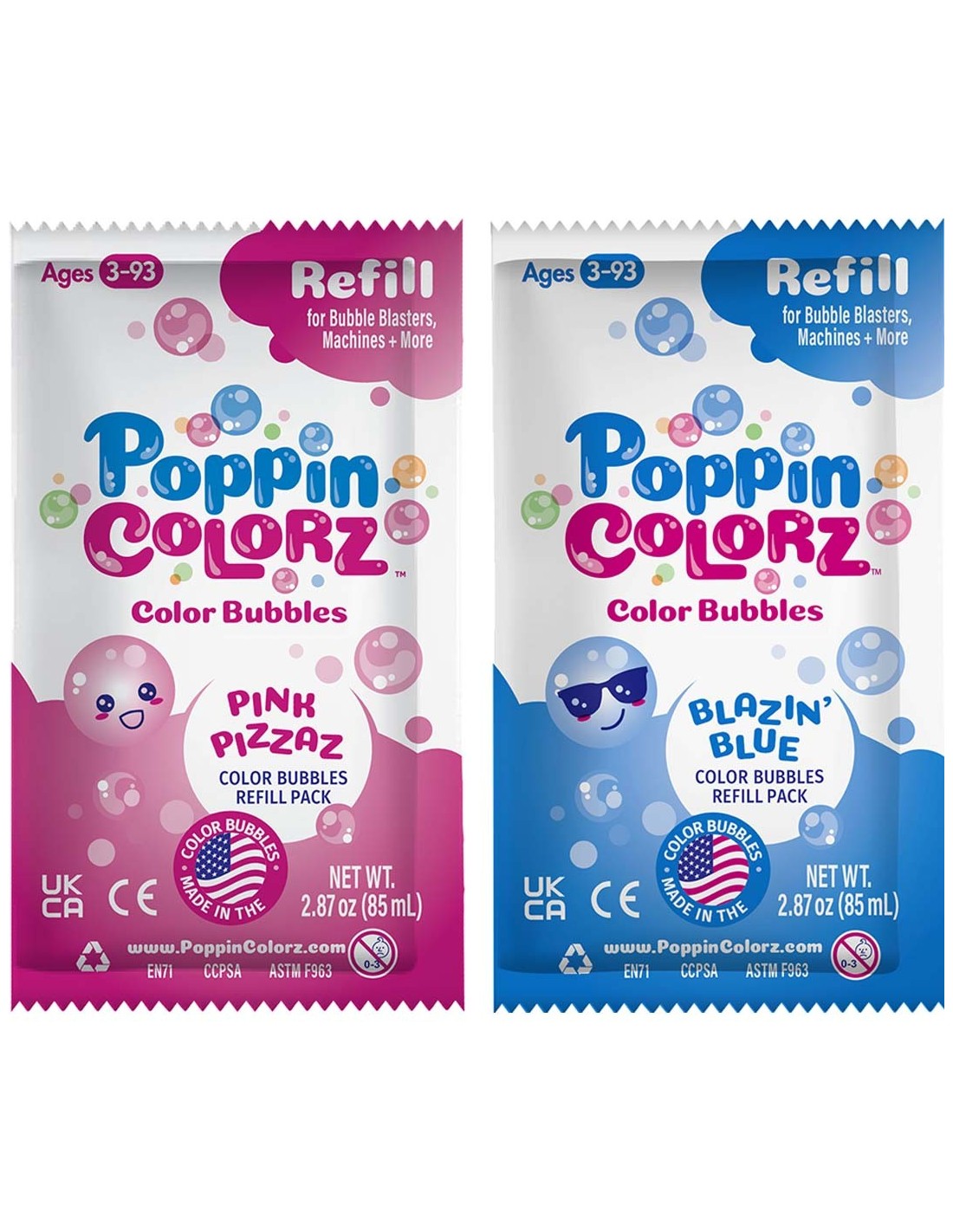 De unieke bubbelformule van de nieuwe PoppinColorz geeft deze bubbels hun felle kleuren – roze of blauw.