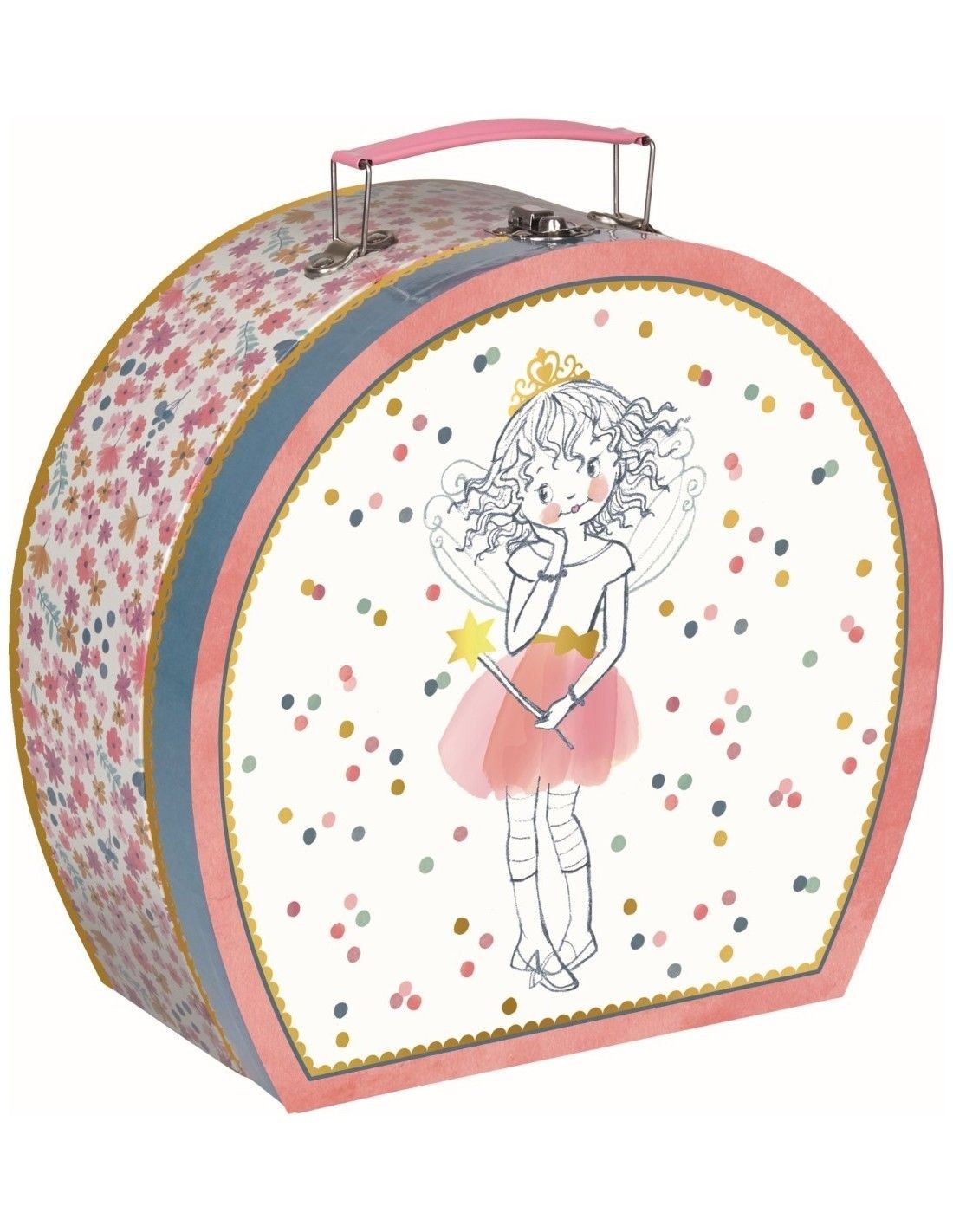 4 kopjes, 4 schotels, 4 bordjes, 1 theepot en een dienblad in een kartonnen koffertje