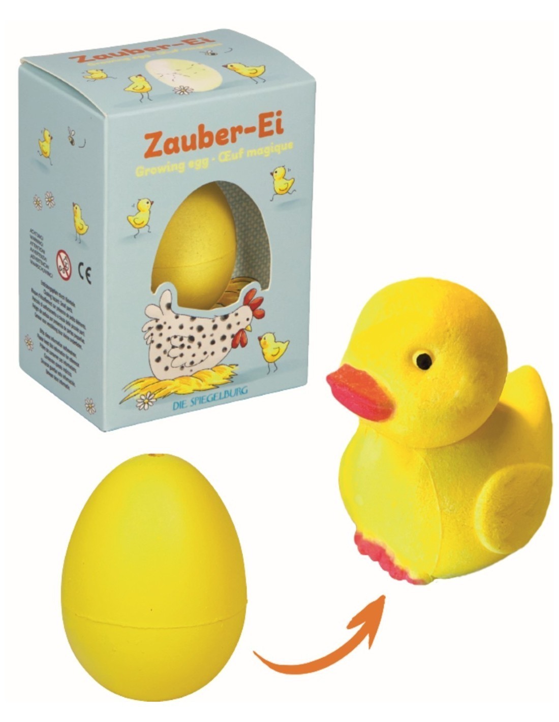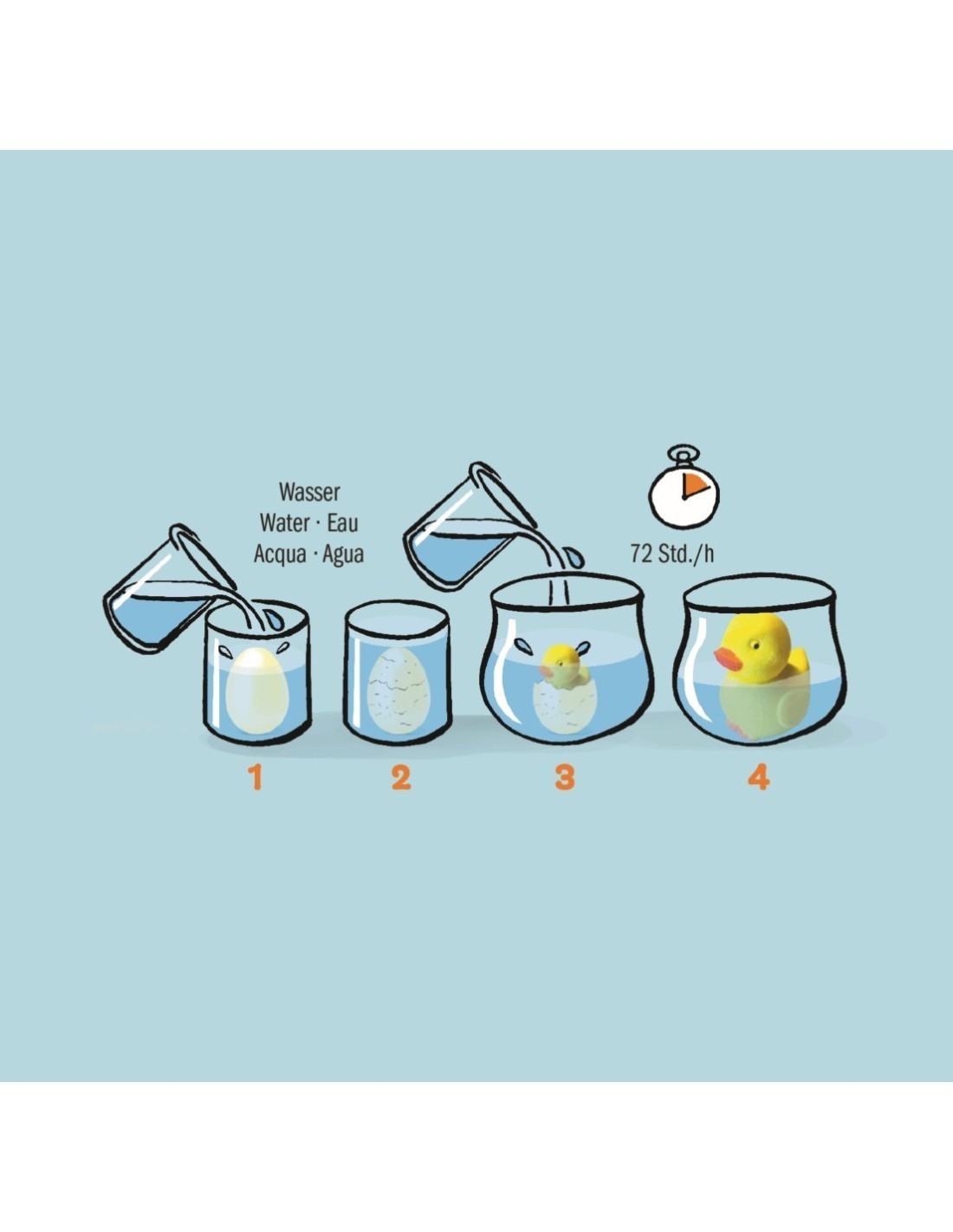 Het ei lost op in het water en er komt een kuiken uit. Met vers water blijft het groeien en bereikt het een grootte van maximaal 8 cm. / Ei gemaakt van maïszetmeel, kuiken gemaakt van plastic / Figuur: ca. 3 x 4 x 3 cm, ei: ca. 6,5 cm, Ø ca. 4,5 cm
